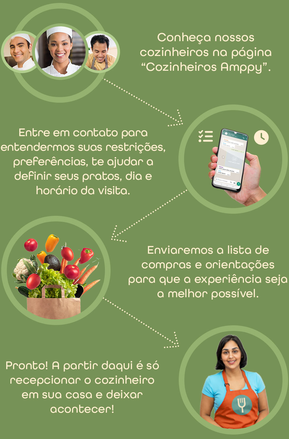 Conectamos você a pessoas que fazem o que amam: COZINHAR. E porque o fazem, o resultado é uma comida deliciosa, que abraça e nutre. Levamos nossos cozinheiros até à sua casa para prepararem refeições deliciosas e seus pratos favoritos para o dia a dia.